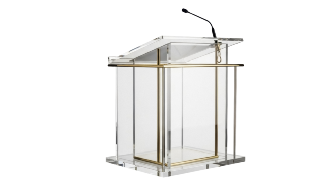 Isolated transparent lectern with microphone, speech or presentation, presentation equipment