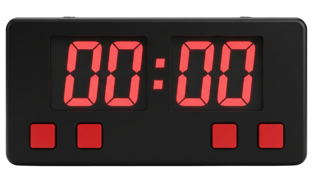 Digital alarm clock displaying zero time with red led numbers on a transparent background