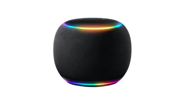 A black, fabric-covered cylindrical speaker with a glowing rainbow light ring
