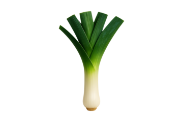 Fresh whole leek vegetable with green leaves and white bulb stem Isolated on a Transparent Background