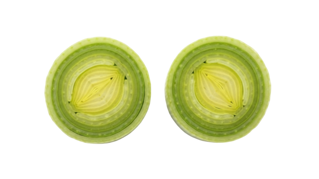 Fresh leek sliced into circular sections with dark green leaves on transparent background