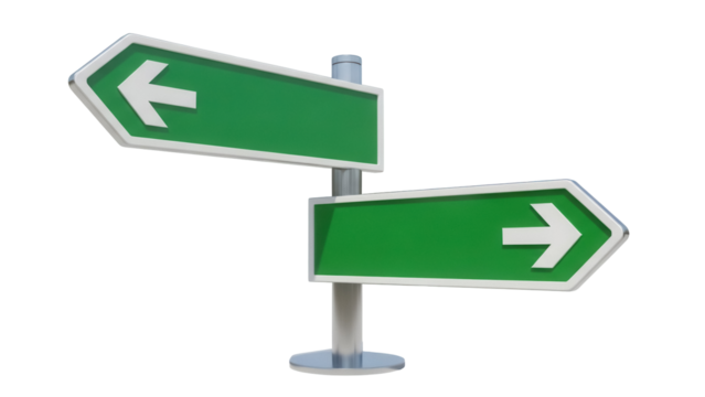 Green direction sign isolated PNG, arrow signpost with left and right directions for navigation and decision making on transparent background