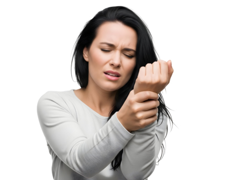 Intense wrist pain causes a young brunette woman to grasp her aching left hand with her right hand, her face contorted in agony and eyes tightly shut, needing urgent medical consultation for joint