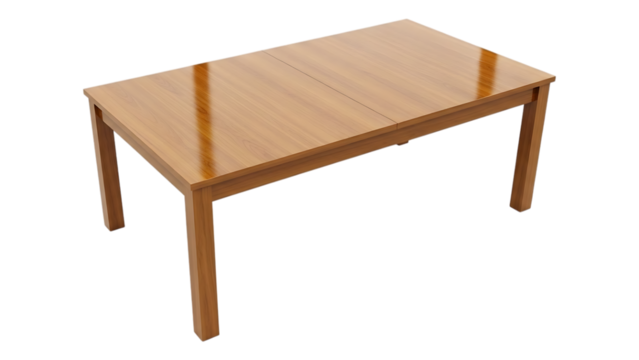 Modern wooden dining table with sleek design and glossy finish featuring retractable leaves for easy storage on transparent background