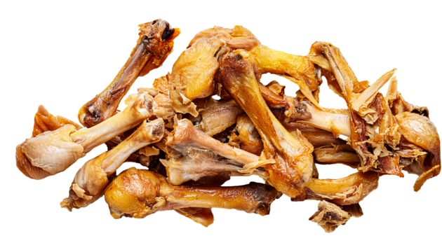 pile of leftover cooked chicken bones on isolated background showing food waste and organic garbage concept in high detail