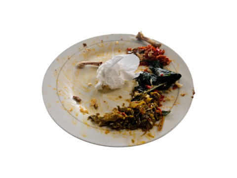 Used plate with leftover food remnants, including chicken bones, chili sauce, vegetables, and a crumpled tissue isolated on white background, transparent PNG