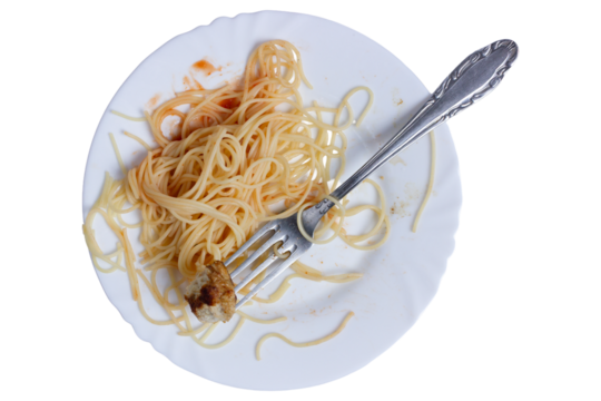 Leftover spaghetti with bolognese sauce on a plate isolated on white transparent background.