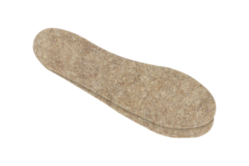 felt insoles for shoes in hand, outstretched hand with shoe insoles isolated from background