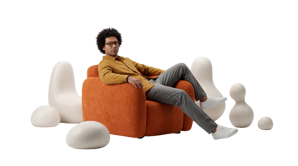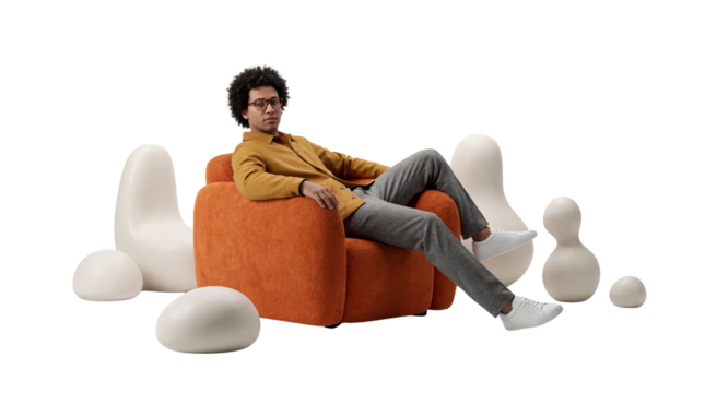 Relaxed young man with afro and glasses sitting in modern armchair amidst abstract shapes