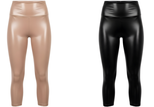 Two pairs of shiny leggings in tan and black colors isolated on transparent background