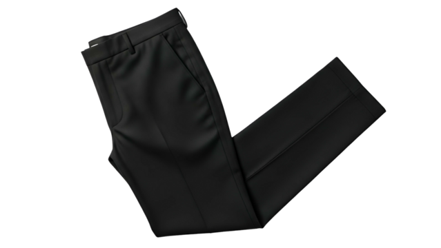 A pair of sleek, folded black trousers, top-down view, isolated on black background