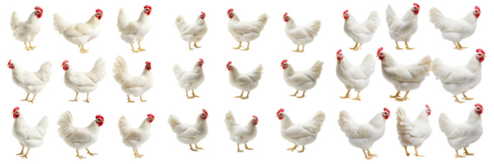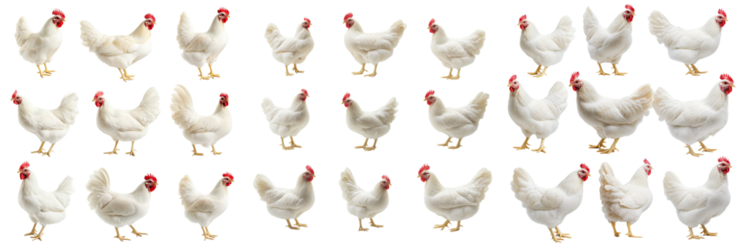 Set of White Leghorn rooster in full body view, captured under softbox lighting, clean and crisp on transparent png background. Ai generated