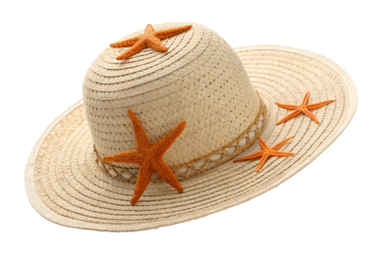 Straw hat and starfish isolated on white or transparent background