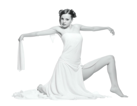 Woman draped in white fabric, posing elegantly on a black background, seated with legs bent and arms outstretched