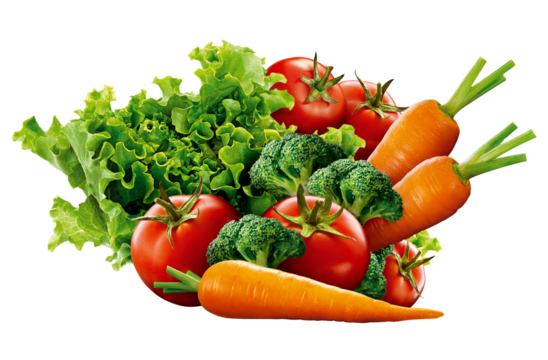 composição de legumes e verduras variadas isolado em fundo transparente - alface, rúcula, tomate, cenoura e brócolis