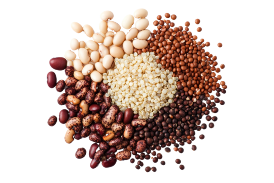 A colorful assortment of various legumes and grains displayed on a white isolated background, showcasing diversity in food sources.