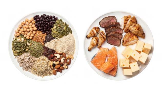 Topdown view of a plate divided to showcase legumes and seeds rich in zinc alongside a contrasting plate of meat and dairy highlighting plantbased versus animal zinc sources.