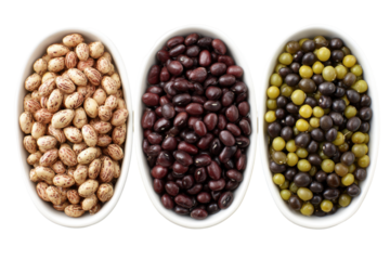 Oval bowls filled with different types of dried beans isolated on transparent background. Three bowls of diverse beans and legumes displayed overhead for healthy eating isolated on white background.