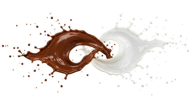 Splash de chocolate e leite formando símbolo do infinito em fundo transparente, representando equilíbrio e contraste visual entre sabores.