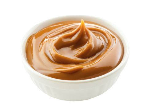 Creamy caramel sauce in white bowl isolated on white background.