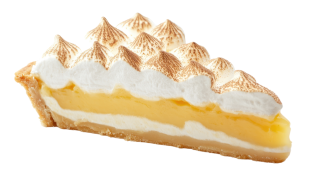 Isolated slice of lemon meringue pie with toasted meringue peaks and crisp crust, dessert