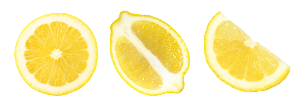 slices of ripe lemon fruit and half isolated, Fresh and Juicy Lemon, transparent png, PNG format, collection, cut out