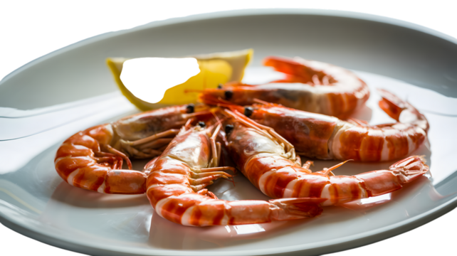 Fresh grilled prawns served on a white plate with a lemon wedge garnish on transparent background