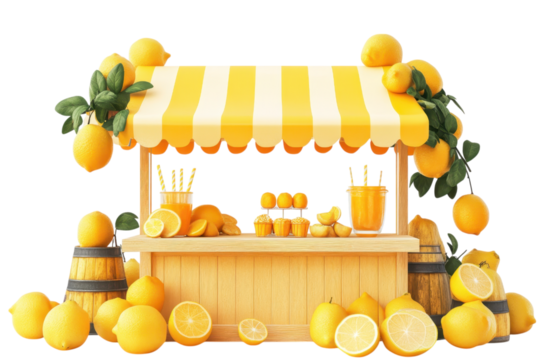 A Charming Lemonade Stand Overflowing With Sunshine-yellow Lemons, Freshly Squeezed Juice, And A Cheerful Striped Awning, Creating A Vibrant Summer Scene Isolated on Transparent Background