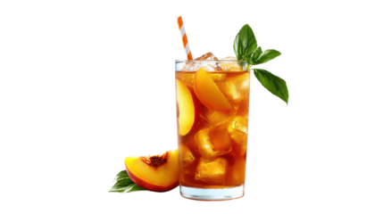 Refreshing iced tea with peach slices and mint leaves on a white isolated background.