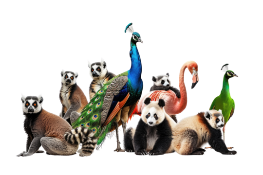 A group of diverse animals including a peacock, lemur, panda, flamingo, and duck in isolated on transparent background