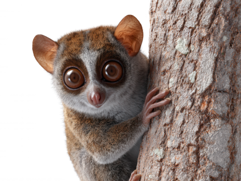 A cute mouse lemur with big brown eyes clings to the side of a tree trunk, its tiny hand gripping the bark and looking curiously towards the viewer now.