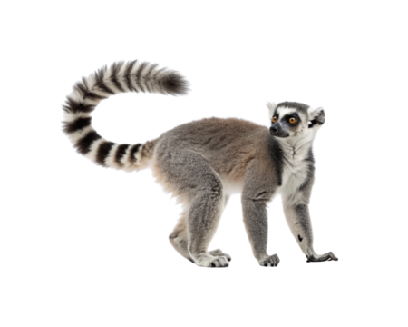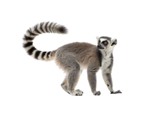 Ring-tailed lemur side view walking isolated studio shot capturing unique wildlife movement and form isolated on transparent background