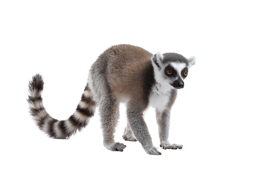 A full-length ring-tailed lemur standing in profile, isolated on a clean white background