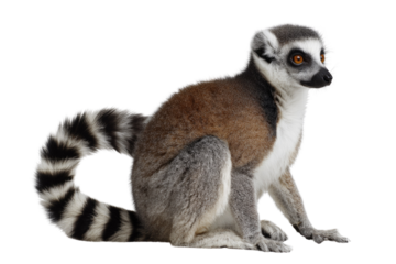 A ring-tailed lemur sits facing right, isolated on a transparent background, showcasing its distinctive markings and fluffy tail. background removed