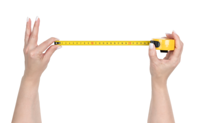 Yellow and gray tape measure with exposed tape on transparent background
