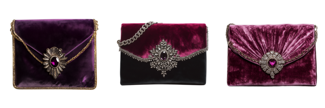 Set of A luxurious velvet handbag in deep royal purple, elegantly positioned against a pristine on transparent png background. Ai generated