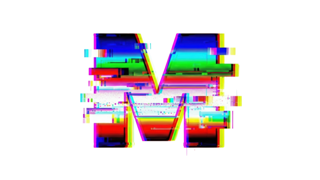 Glitch VHS letter M with intense analog distortions and pixel noise on white background