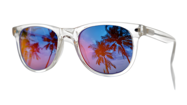Crystal clear sunglasses capture vibrant tropical sunset reflections for your next escape isolated on white background