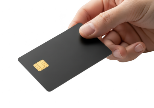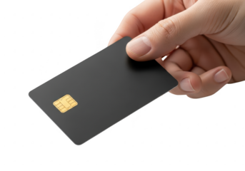Hand holding a blank black credit card isolated on transparent background