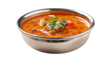 Traditional Indian dal makhani served in white bowl garnished with cream and fresh coriander leaves isolated on transparent background