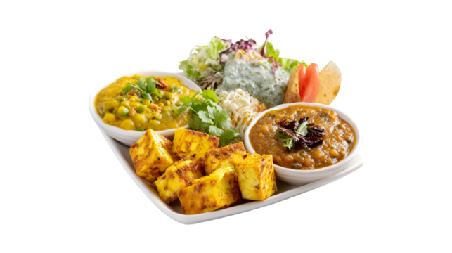 A vibrant Indian vegetarian platter with grilled paneer cheese flavorful curries a fresh salad and assorted side dishes