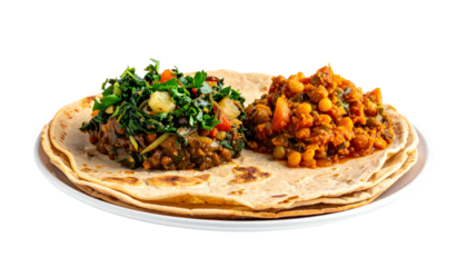 An assortment of indian thali meals isolated on transparent background, featuring a variety of colorful curries, rice dishes, breads, and yogurt, showcasing the rich and diverse flavors of indian cuis