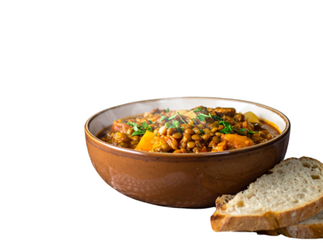 Steaming hot lentil soup garnished with fresh parsley in white bowl on transparent background