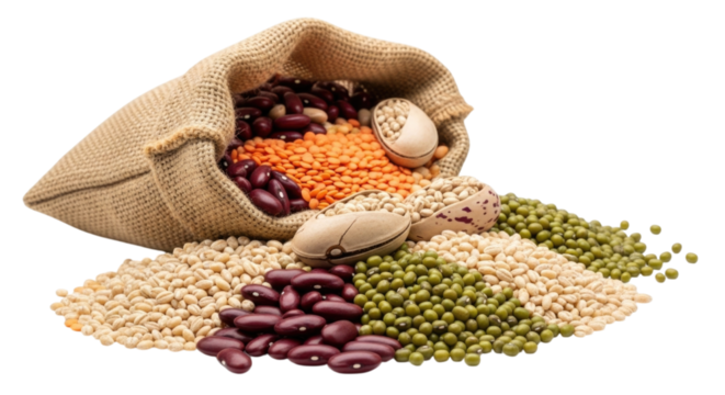 Burlap Bag with Assorted Grains, transparent background, cutout PNG