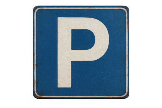 Parking sign showing white capital letter p on blue, square, old, worn traffic symbol with transparent background