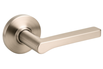 Modern brushed metal lever door handle on a round rosette on a transparent background