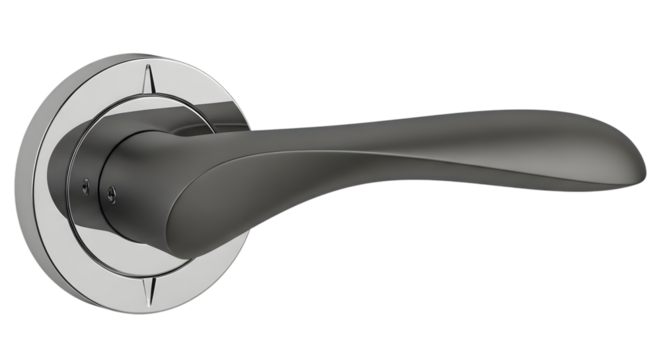 Modern brushed metal lever door handle on a round rosette on a transparent background