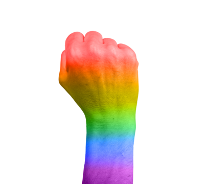 Raised fist symbolizing LGBT pride and solidarity. A powerful gesture in the fight for equality and freedom, representing unity and strength. Colorful rainbow flag background, advocating against.