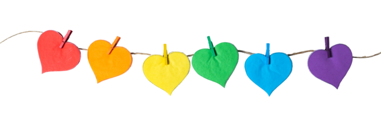 Rainbow multicolored paper hearts on rope, isolated on white or transparent background cutout.