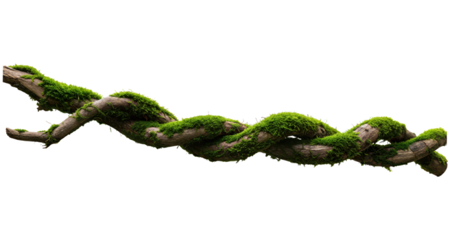realistic jungle liana with green moss and textured bark isolated on transparent background